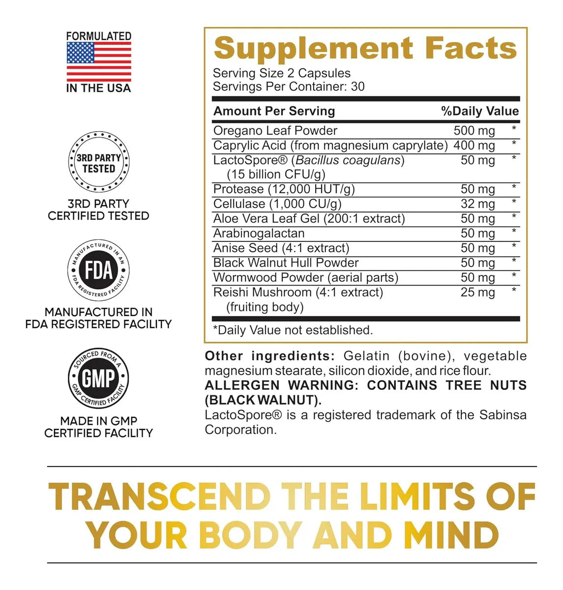 Contiene hoja de orégano, ácido caprílico, aloe vera, nuez negra, hongo reishi, anís, wormwood y probióticos que trabajan juntos para eliminar toxinas, hongos y mejorar tu bienestar intestinal.